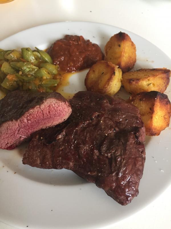 Wir waren gestern auf einer Straußenfarm und haben zwei Straußensteaks mitgenommen. Die gabs dann mit Tomatenchutney, Rosmarinkartoffeln und eigentlich Bohnen in gelber Tomatensoße, die sich dann aber als Zuckererbsen entpuppten. So ists halt, wenn man die Gefrierbeutel nicht beschriftet ::)