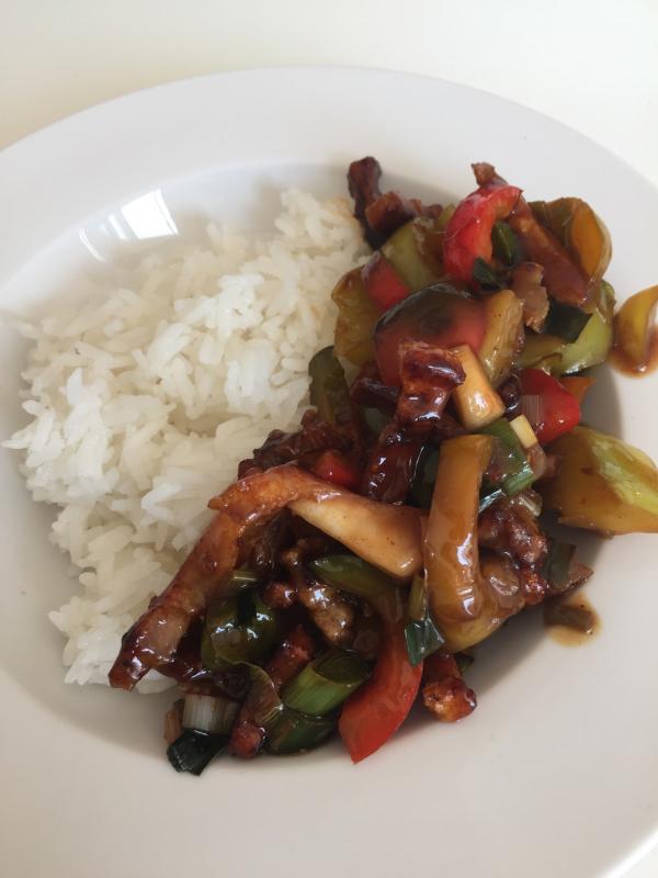 Heute gabs zweimal gegartes Schwein mit Paprika und Lauch aus dem Garten. Dazu Reis