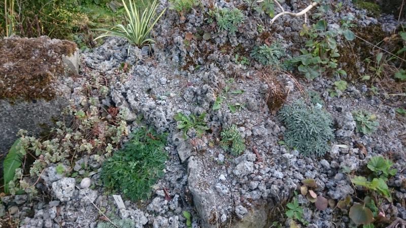 Das habe ich so vorgefunden. Es sind Betonplatten (?), hochkant aufgestellt und dazwischen Geröll, das einer der Vorbesitzer kleinpickerte. Was genau er damit vorhatte, weiß ich nicht. Der kleine Wall verläuft in Nord- Süd- Richtung. Auf diese Weise habe ich eine eher absonnige Seite für Saxifragen. Die andere Seite ist nicht so locker, daher schwieriger zu bepflanzen. Bisher habe ich dort 3 unterschiedliche Yucca angesiedelt.
