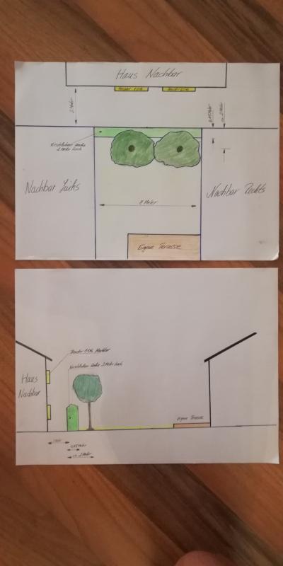 Unser Grundstück ist 8 Meter Link entfernt!1 zu unserem Garten steht in 3 Meter Entfernung ein Haus das im EG 2 Fenster und genau darüber im 1.OG auch zwei Fenster hatt.