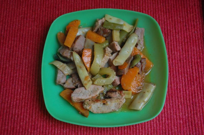 Hier gab es Grillrestegemüsepfanne (Grillfleisch, Süßkartoffel, Möhre, Bohnen, Zucchini).