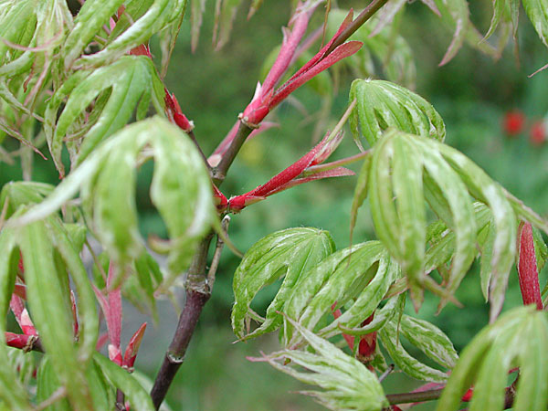 Katsura stand bisher ziemlich sonnig. Im letzten Sommer hat das Laub ganz schön gelitten - vielleicht ist er deshalb nicht gewachsen. Jetzt habe ich ihn umgesetzt. Gesund sieht er auf alle Fälle aus, also mache ich mir keine Sorgen.@ bernhard: Katsura steht im Garten, nicht im Kübel. Müsste man bei Kübelhaltung nicht vor Durchfrieren schützen? Ich hatte einen Acer negundo 'Flamingo' einen Winter im Topf gelassen, und das war sein Ende.Stimmt. Orange Dream sieht im Augenblick traumhaft aus. Er bekommt höchstens 3 Stunden Spätnachmittagssonne, wodurch die Blätter auch später noch eine ganz hübsche Farbe behalten. Ein einziger Ast ragt in die fast Dauersonne hinein, und da können die Blätter im Sommer tatsächlich ziemlich mitgenommen aussehen.Was mir an meinem Orange Dream am besten gefällt, ist die Wuchsform. Ich hatte Glück und ein schönes Exemplar erwischt - zum Formschnitt bin ich selbst zu unfähig.Der Vollständigkeit halber, hier der Austrieb von Ukigumo. Das Weiß ist nicht Mehltau.