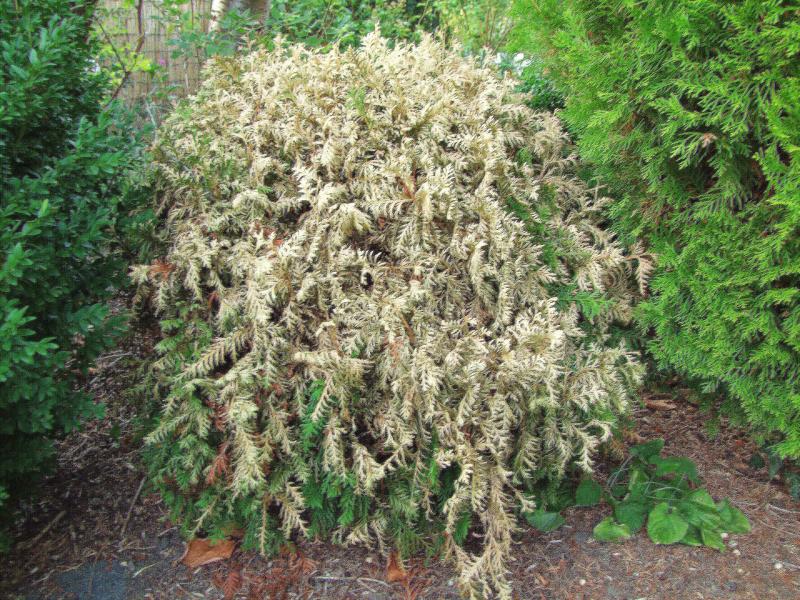 Ich habe wieder ein Dürreopfer zu beklagen.Die Koniferen geben langsam auf.Hier Kugellebensbaum 'Danica'.