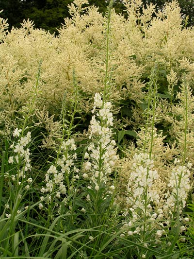 Weiter aus dem weißen Beet: Epilobium angustifolium album, das wunderschöne weiße Weidenröschen. Es wuchert - wie seine rosa Verwandte - seehr schön, sollte es hier auch, hat es hier auch, aber der Gärtner hielt die Ausläufer für Unkraut