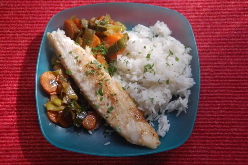 Pangasius mit Basmatireis und Gemüse (Möhre, Porree, Sojasauce)