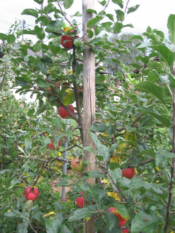 Der Baum ist ein ziemlich verschnittener Buschbaum, Unterlage vermutlich M9 - deshalb die untypische Reife, darüber hab' ich schon öfters berichtet (Seestermüher wäre auch Winterapfel und ist auf auf M9 ebenfalls derzeit reif).