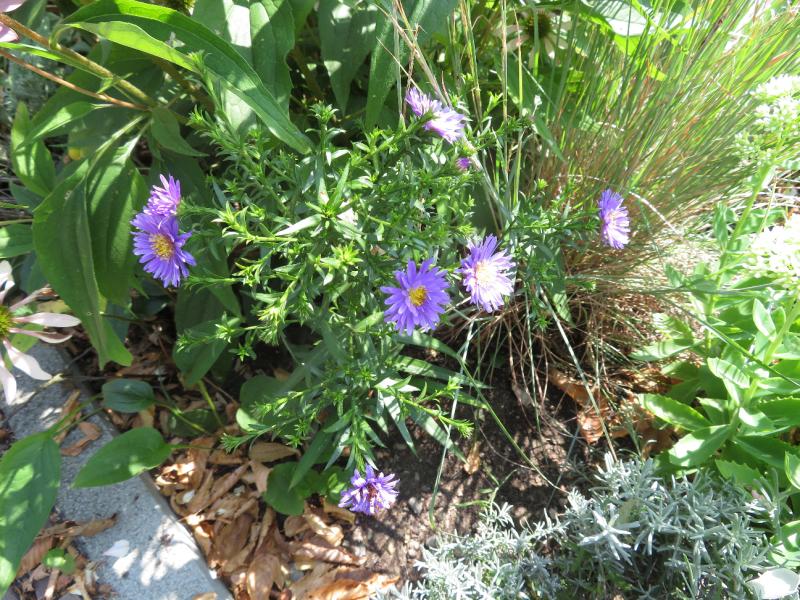 Eine novi-belgii, die hier seit langem durchhält, wüchsig, blühfreudig und im Herbst ein Insektenmagnet ist, hatte ich wohl mal vom Straßenrand oder durch den zaun eines verwilderten Gartens. Ich weiß es nicht mehr. Bilder vom letzten Jahr: