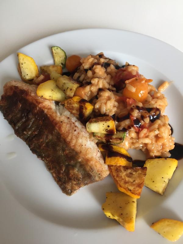 Hier gabs auch Fisch. Mit Cocktailtomatenrisotto und gebratener Zucchini