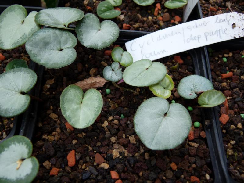 C. coum "silver leaf, dark purple flowers", eine Pflanze, die in seinerm katalog eher eigenartig als wirklich schön aussah: fast weißes laub und dazu der Kontrast der ganz tief dunkel-violetten Blüten.
