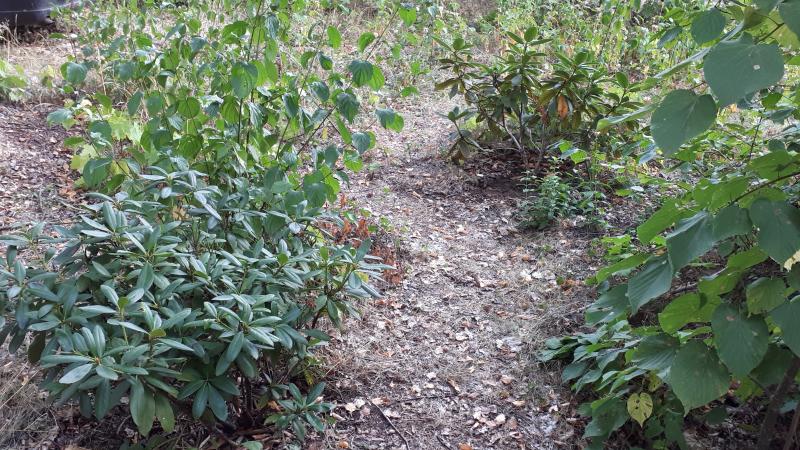 Vorn die Rhodos, dann kommen die Fichte und die Eibe - wie eine Trennung und alles, was ab da Richtung Haus geht sollte dem Wiesengedanken unterworfen werden....