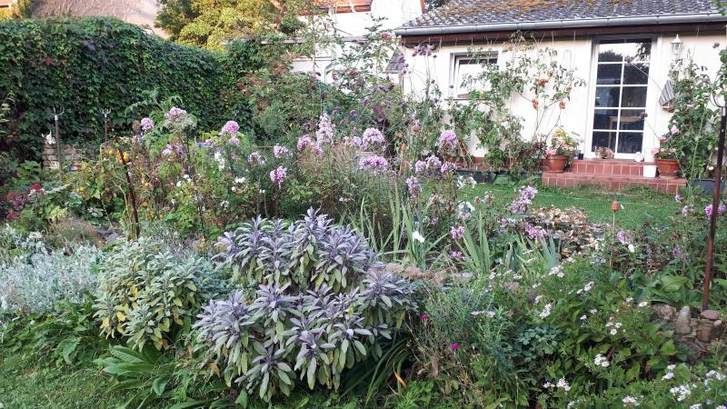 hier noch mal die Gartenseite - da ist ne Feldsteinmauer und davor Salbei und anderer Schnickschnack