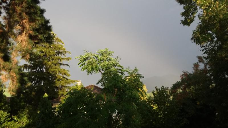 Eine Unwetterwarnung kam vorhin. Es ist unglaublich drückend, donnert heftig am unguten Himmel, aber laut Radar zieht (mal wieder) alles knapp südlich vorbei...