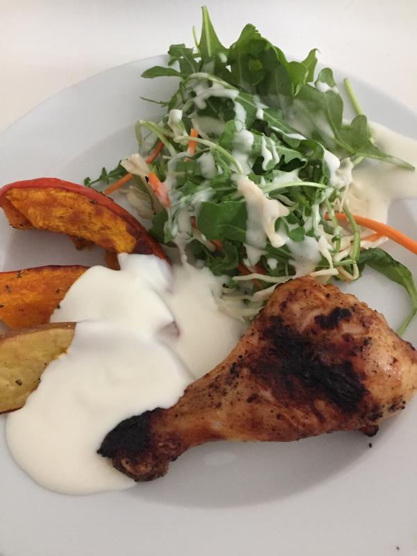 Hähnchenschlegel vom Grill, Kartoffeln und Kürbis aus dem Ofen, knoblauchjoghurt und salat