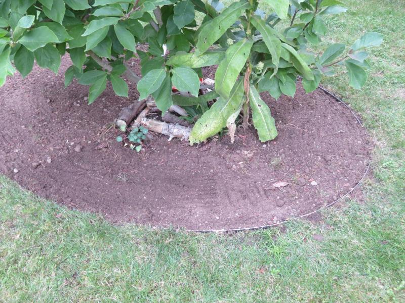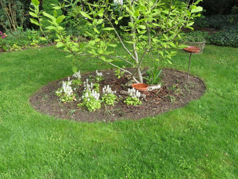 Vor dem Haus habe ich die Magnolien nur gemulcht ohne Begrenzung, aber da wächst der Rasen nicht so rein bzw. die Magnolien sind so schmal, dass man immer noch gut mähen kann.