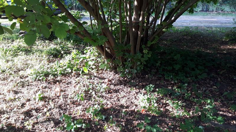 Direkt daneben der Haselnussbusch, unter dem inzwischen zahlreiche Frühjahrsblüher sind - ich müsste dort aber noch alles rausziehen, was ich da nicht haben will....das Foto ist von rechts aufgenommen, nicht vom Weg