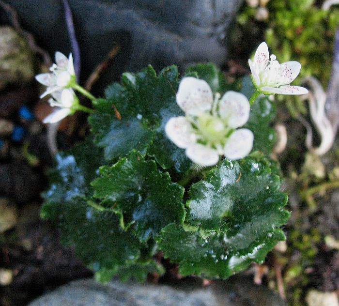 Kennt jemand diese Saxifraga? Ich fand sie im letzten Jahr in meinem Garten. Die Pflanze hat in etwa die Form und Größe eines halben Tischtennisballs. Die Textur ist ein wenig sukkulent. Die Blüten sind typische S. rotundifolia-Blüten, allerdings auf sehr kurzen Stielen. Im letzten Jahr hatte sie die Größe wie in diesem, hat nur nicht geblüht.