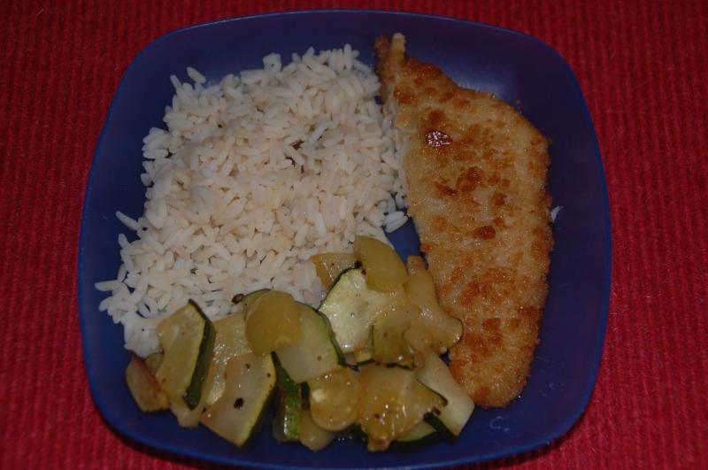 panierte Scholle mit Kaffirlimettenreis und Zucchini-Tomatillo-Gemüse (mit Kubebenpfeffer)