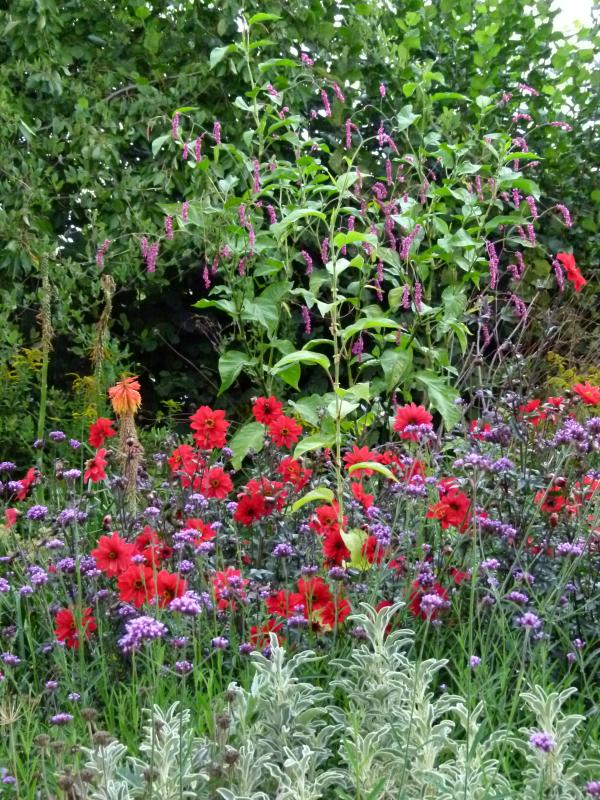 Eine meiner liebsten Einjährigen, im Hintergrund: Kiss-me-over-the-garden-gate, Polygonum (Persicaria) orientale, 2,5 Meter schafft sie in einem Jahr.