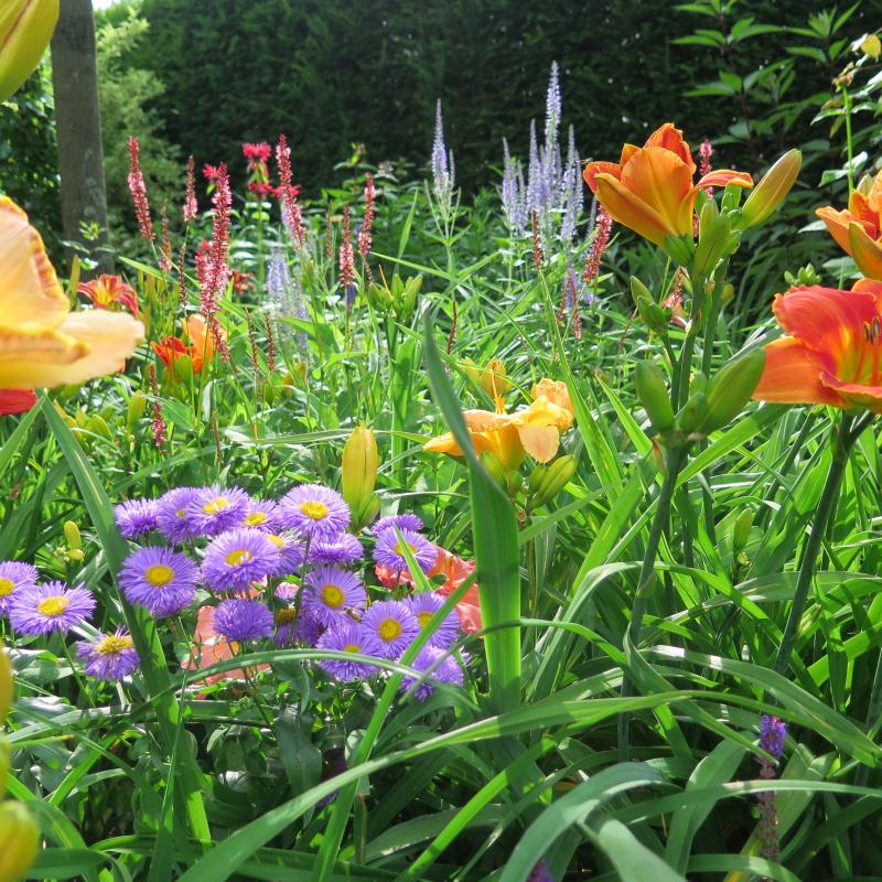 Hier noch ein Foto. Man sieht zwar nicht so genau, aber es gibt einen Eindruck. Ich habe mit Astern und Knöterich versucht die orangigen wie Avantgarde und eben Renie´s Deligt "zusammen zu bringen". Sehr schwierig.