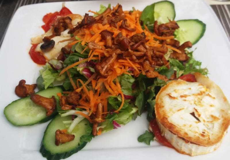 Auswärts gab es heute Salat mit gebratenen Pfifferlingen und gratiniertem Ziegenkäse
