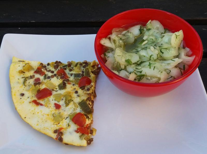 Omelette mit Lauchzwiebeln und Tomaten, dazu Gurkensalat