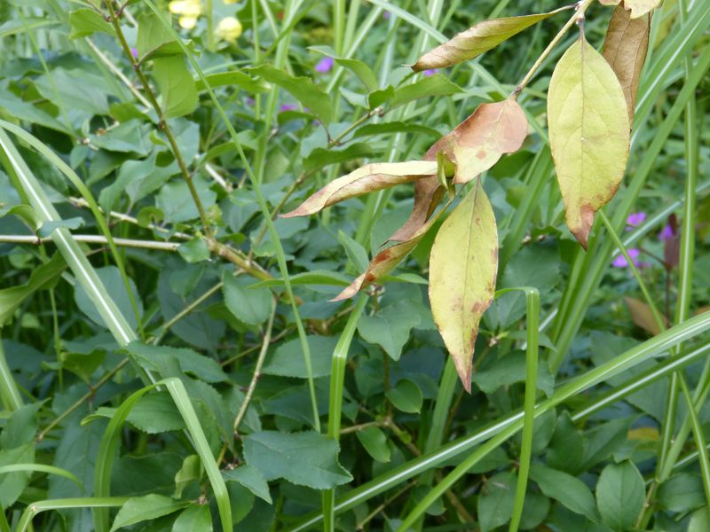 Eine ähnliche Symptomatik habe ich hier an einer Lonicera fragrantissima immer mal wieder.Bislang völlig unauffällige Triebe zeigen zunächst solche Blattverbräunungen, dann sterben die Blätter und der gesamte Triebe ab. Bei Lonicera fragrantissima kommen dann von der Basis neue gesunde Triebe.Interessanterweise sind auf ähnliche Weise auf schon zwei Thujen 'Smaragd' von Nachbars Hecke 1 m weiter längs erst eingetrocknet, dann abgestorben.Ich hab's bislang auf den schweren und verdichteten Boden geschoben, der zur Vernässung neigt. Was ja nicht heißt, dass genau dadurch nicht irgendwelche Phytophthora "zuschlagen".