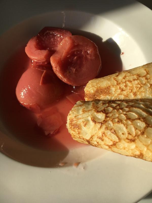 Hier gabs Pfannkuchen mit selbst eingekochten Pfirsichen (in rotem Apfelsaft eingekocht).