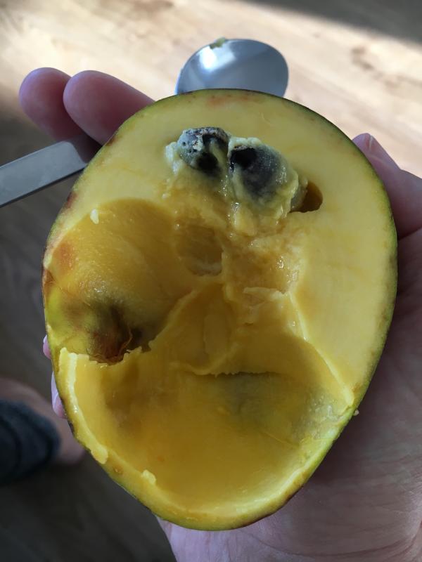 Am ehesten lässt sich die Indianerbanane mit einer Mischung aus Banane und Mango beschreiben. Sie riecht allerdings ganz anders als sie schmeckt. Tropisch und nach Mandarine. Nachdem ich sie aufgeschnitten hatte roch die ganze Küche danach :D Die Kosistenz ist absolut cremig und faserfrei, am ehesten mit Avocado zu beschreiben, obwohl hier das fettige Mundgefühl fehlt. Das Fruchtfleisch direkt um den Kern ist noch weicher, fast sahnig und schmeckt nach Karamell.