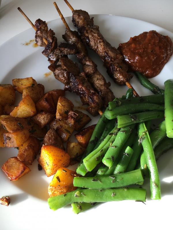 Wir hatten heute Lammspieße vom Grill, Bratkartoffeln aus rohen Kartoffeln mit Rosmarin und Knoblauch, grüne Bohnen und Tomatenchutney.