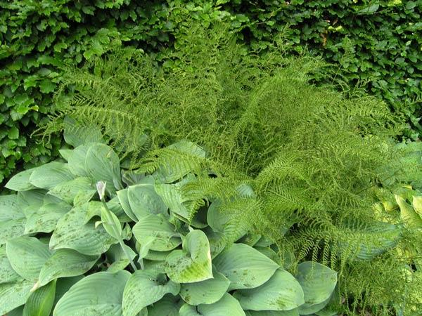 ein besonders filigraner Farn ( welcher mag das sein?) mit einer Hosta