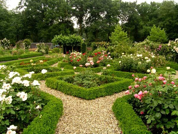 Das Rosarium mit buxgesäumten Quartieren, topgesunde und gepflegte Rosen wachsen hier. Die Buxhecken werden von Hand geschnitten