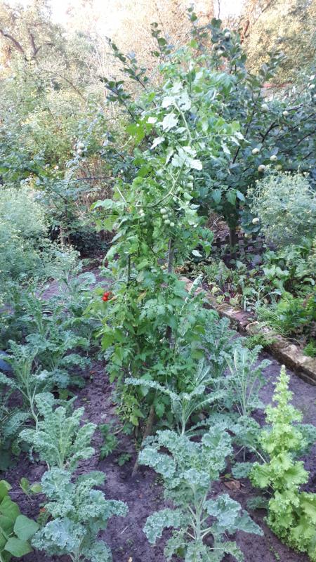 Grünkohl und in der Mitte eine extrem wüchsige und gesunde Freilandtomate.