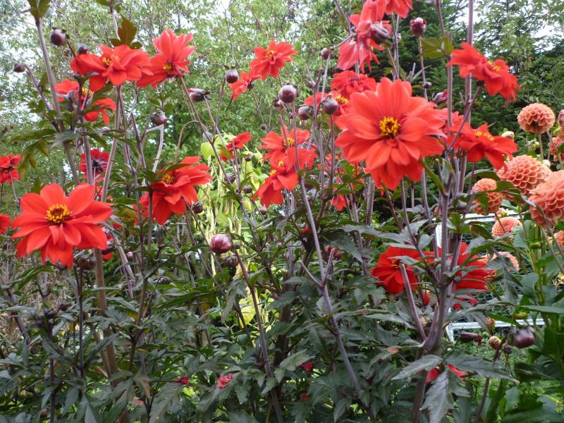 Mal ein Knips vom rechten Dahlienbeet am Gewächshaus. 'Maxime' blüht auf Augenhöhe, angegeben war sie bis 1,20m.