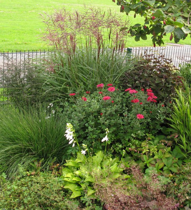 Bis auf 'Dixter Orange' blühen hier bislang nur die frisch gekauften Topfchrysanthemen.