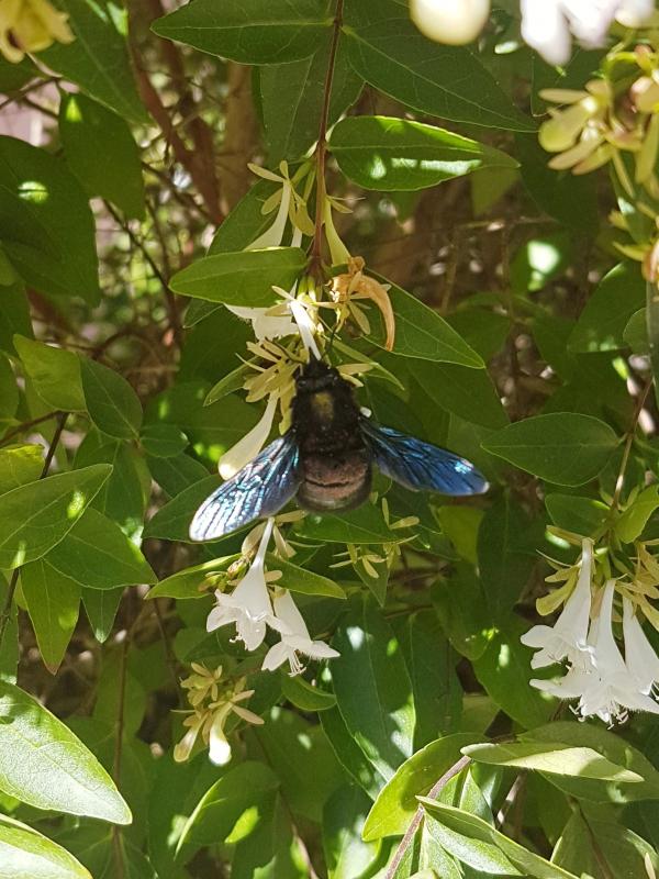 Ich würde auf Holzbienen tippen. Hier in Nordhessen sind sie nicht häufig, erst seit die Sommer extrem warm sind sieht man sie hin und wieder. Vor allem, wenn es genügend Schmetterlingsblütler gibt ;)!