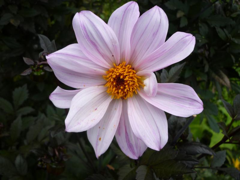 Wie heisst diese Dahlie? Sie ist sehr hochwachsend, hat ganz dunkles Laub und rosa angehauchte Blüten, je kälter es draußen ist je mehr rosa sind die Blüten.