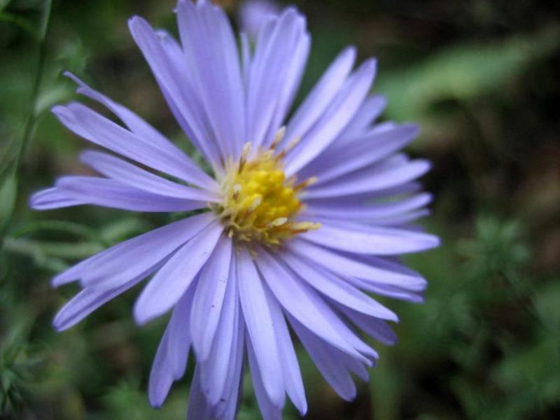 Eine niedrige Aster mit überhängenden Zweigen mit zart blauvioletten kleinen Blüten. Ein Findling aus dem Härle-Arboretum in Bonn.
