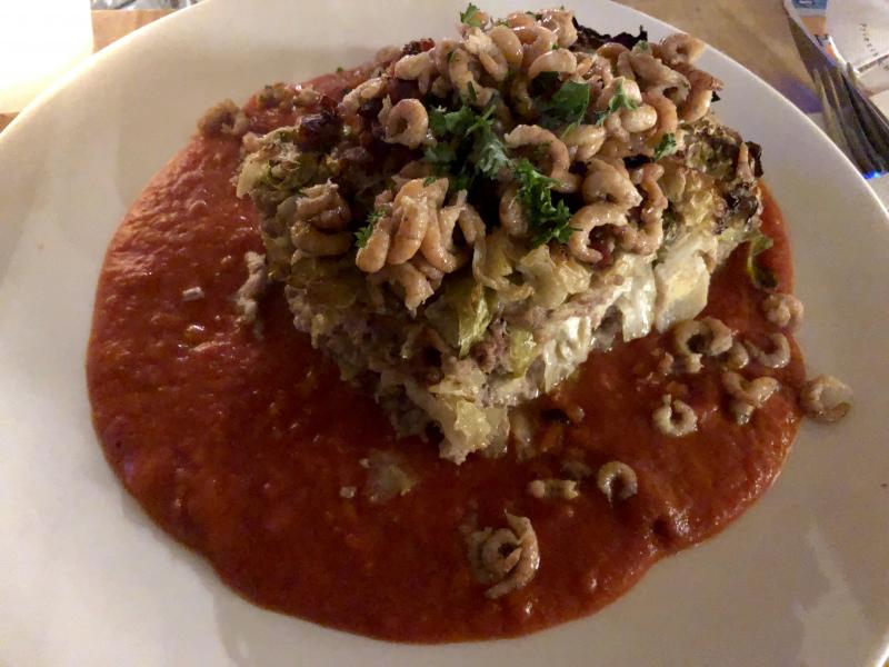 wir waren urlaubsessen, ich hatte kohlpudding auf tomatensoße mit krabben