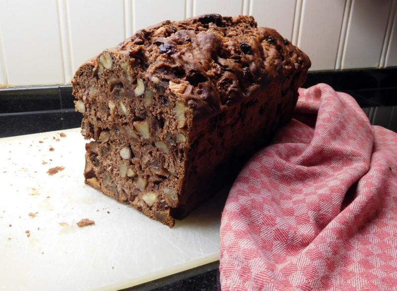 750 g Äpfel schälen und kleinschneiden, mit 150 g Zucker und 4 EL Obstschnaps (alternativ Stroh-Rum) über Nacht in einer abgedeckten Schüssel ziehen lassen. Am nächsten Tag mit 500 g feinem Weizenmehl, 1 Pck. Backpulver, 200 g gemischten Nüssen und 200 g Rosinen (oder einfach 2 Packungen Studentenfutter), 2 EL Kakaopulver und 2 TL Zimt vermischen. Wenn der Teig zu streng ist, ggf. noch einen Schuss Apfelsaft zugeben. Mit den Händen gut vermengen und in eine gefettete Kastenform geben. Bei 220 Grad ca. eine Stunde backen, nach der Hälfte der Backzeit oben mit Alu abdecken.