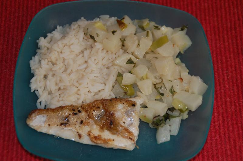 Reis mit Zander und leckerem Mairübengemüse (Mairübe, Ingwer, frischer Szechuanpfeffer, Lauchzwiebel, Salz, Butter)