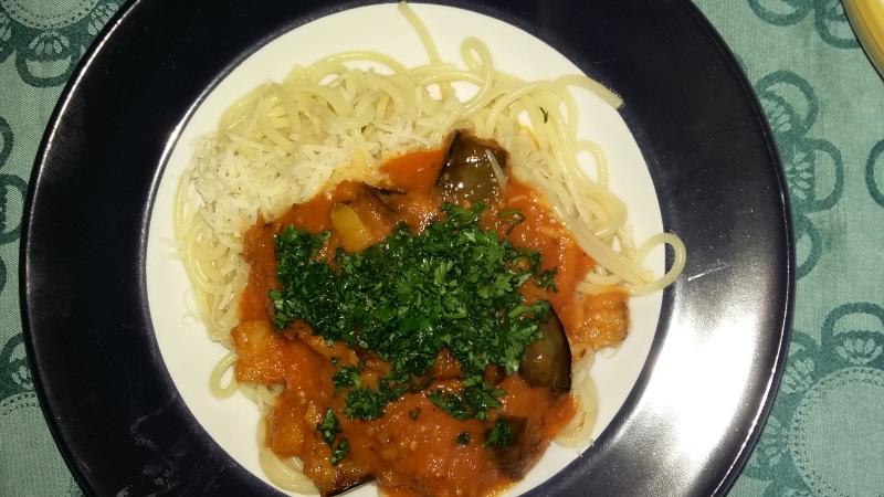 Bei uns gabs Gemüsesuppe (Cannellinibohnen, grüne Bohnen, Möhren und Lauch) mit Schweinebauch. Cheddar-Scones mit Feigen-Zwiebel-Marmelade. Spaghetti mit Auberginen-Tomatensauce, Parmesan und Petersilie.