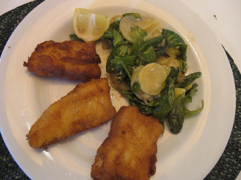 Hier gab es nach längerer Abstinenz wieder einmal schnödes Kabeljaufilet paniert mit Erdäpfel-Vogerl (aus dem Garten)- Salat