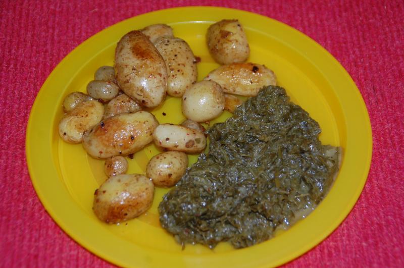 Mittagessen: geschonkene feine Pellkartöffelchen (ich glaube 'Granola' ???) in Gänseschmalz, rotem Pfeffer und Wacholderbeeren gebraten mit Schnittselleriemus (welches so pur recht bitter ist, aber am Tisch gab es noch ein Löffelchen Creme fraiche dazu, dann ging es)