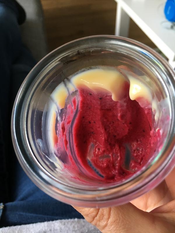 Und zum Nachtisch das letzte Gläschen schwarzes Johannisbeermousse mit Vanillesoße vom Geburtstagsgelage :P