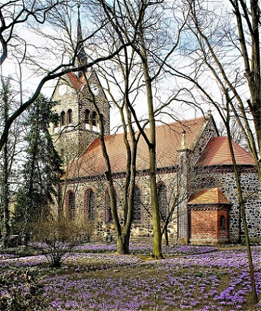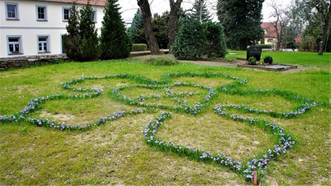 Im Anhang noch ein Bild vom Torgauer Umfeld: Das Lutherwappen mit Schneeglöckchen und Chionodoxa vor der Heilandskirche Beilrode