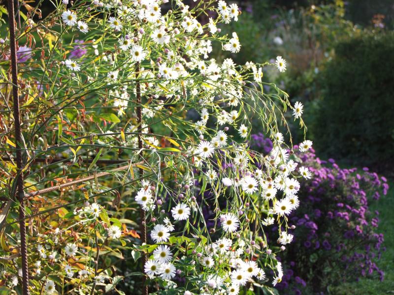Ganz gut gefällt mir Boltonia 'Snowbank'.Im letztem Jahr noch verhalten,legte sie jetzt richtig los.Die kleinen Gänseblümchen sind in der Masse sehr schön anzusehen.