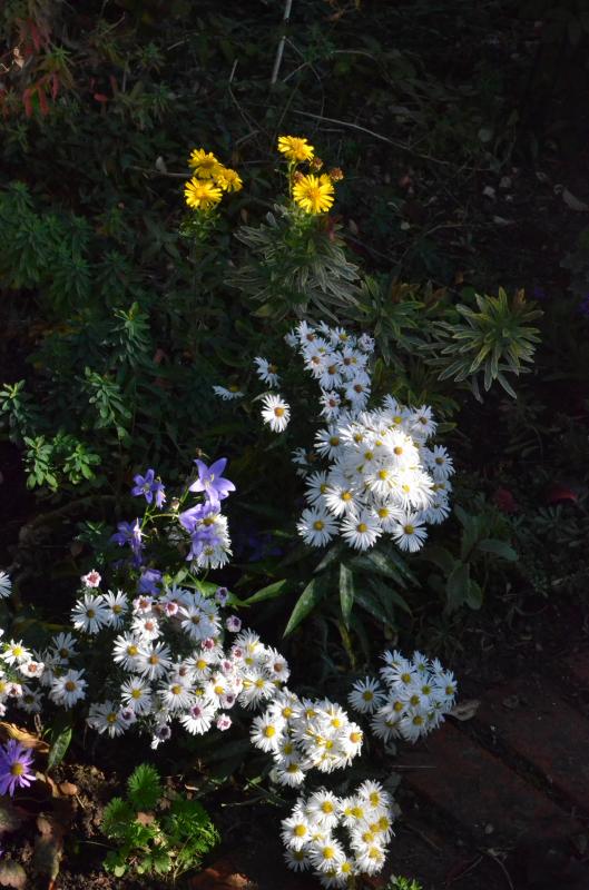 Heute war das Licht noch einmal richtig toll, und der "goldene Oktober" macht seinem Namen wirklich alle Ehre. Die Astern geben ihr Bestes, und meine letztes Jahr vor dem Gartenhaus gepflanzte Felsenbirne ist dieses Jahr wieder ein ganzes Stück gewachsen. Der Farbkontrast ist im Moment einfach großartig (die unansehnliche Plane möge man sich wegdenken und stattdessen Schieferplatten vorstellen, wenn ich endlich mal die Zeit dafür habe... ;) ).