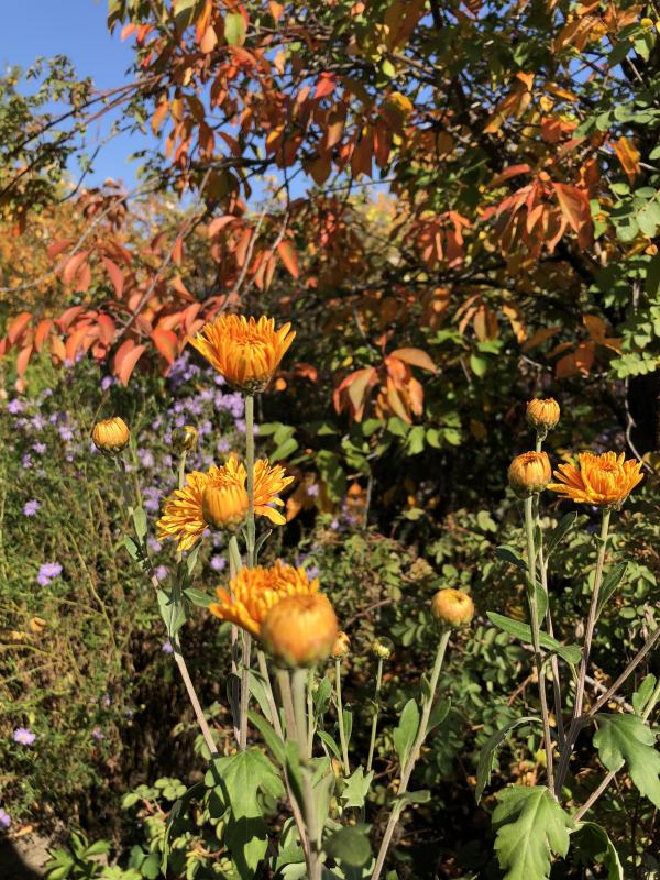 Manchmal hat man Glück und die Topfchrysanthemen kommen noch ein/zwei Jahre wieder. (Die Sorten halten hier auch oft nicht länger) Diese auf dem Foto ist wieder eine der 50 Cent-Chrysanthemen, die ich kürzlich vom Markt mitbrachte. Vor der Päonie 'Bartzella' hat sie jetzt einen Platz im Beet gefunden.