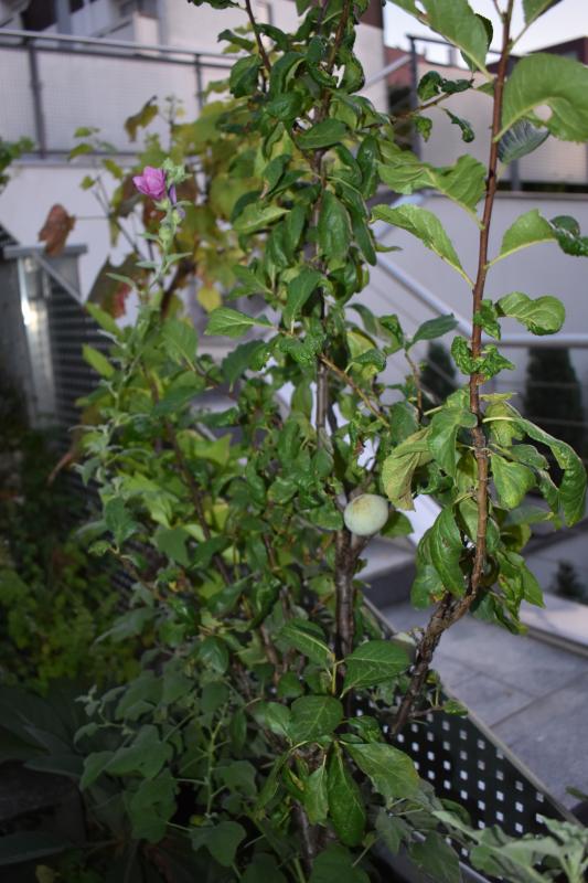 Es gibt noch eine Pflaume im Topf, die schön geblüht hat aber leider sehr mit Läusen zu kämpfen hatte.