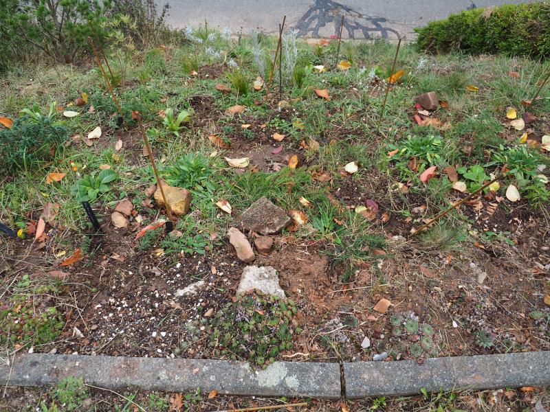 Auf diesem Stück habe ich Trittstufen in den Boden gehauen. Sonst ist da nicht zu arbeiten. Geplant habe ich die sämtlichen Sonnenröschen über diese Partie zu verteilen. Alle Primula veris. Ein erwachsenerer Vitex agnus-castus, ein zweites Exemplar Seriphidium canum. Die übrigen Salvia nemorosa. Eigentlich die ganze Liste vom vorletzten Beitrag. Auf 15 qm.